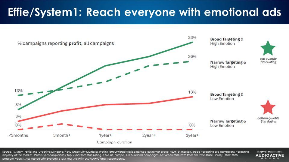 Most audio ad campaigns feature low emotion and rational messaging, along with narrow targeting, yielding the lowest long-term profit