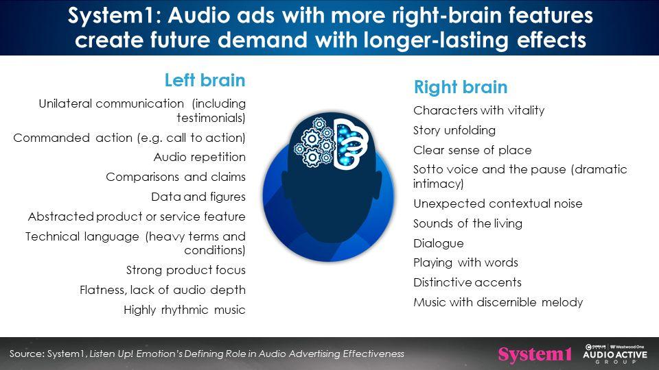System1, the creative measurement firm, has tested hundreds of thousands of ads across all media. Their research finds campaigns with right-brain elements drive the strongest share growth for the marketer.