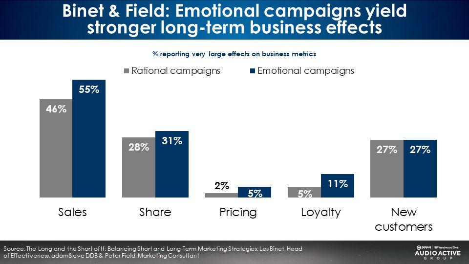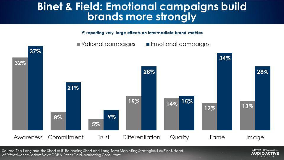 Emotion-based campaigns generate greater brand equity, according to Les Binet and Peter Field, the godfathers of marketing effectiveness