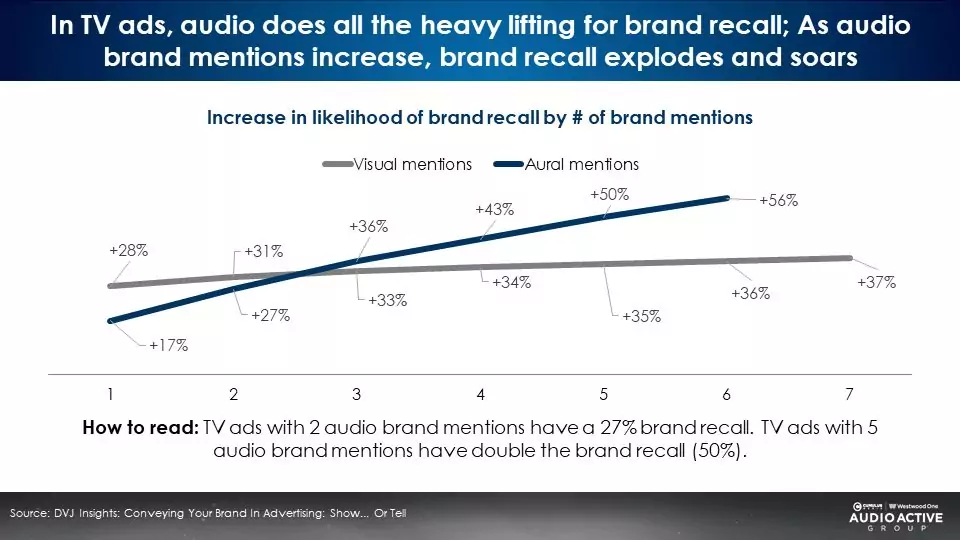 A major study from DVJ Insights found that the more times the brand name was said in the audio track of the TV ad, the greater the brand was linked to the ad