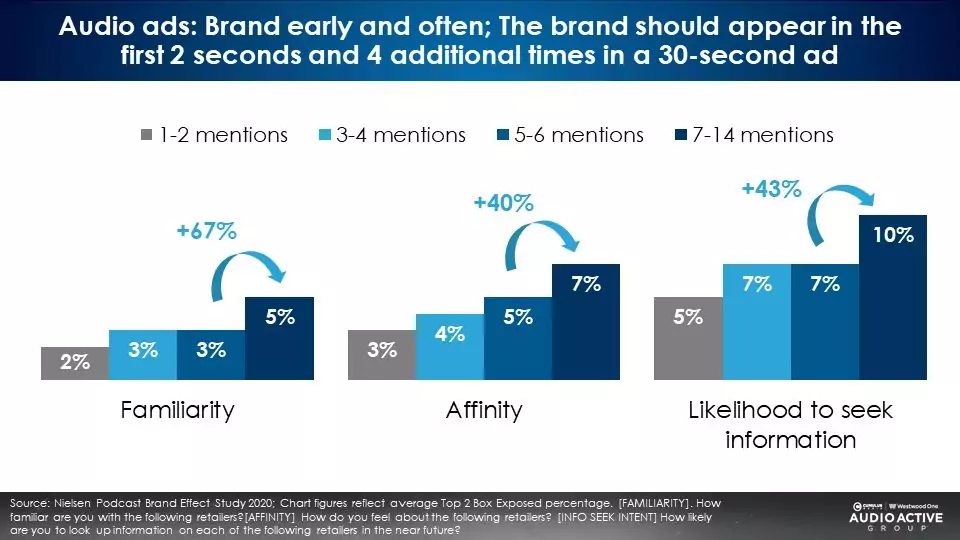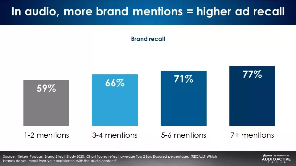 Hundreds of Nielsen podcast brand effect studies reveal that the greater the number of brand mentions, the stronger the brand equity