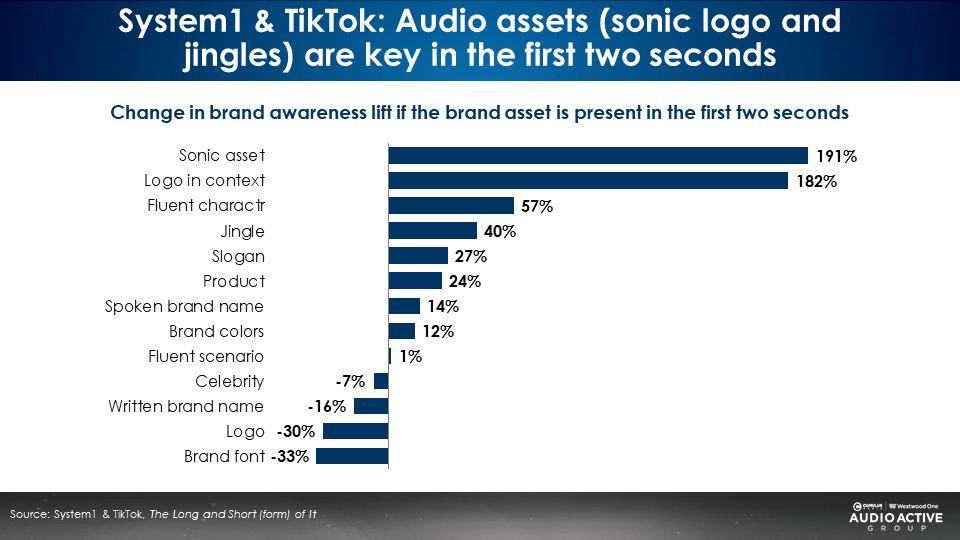 A new study from System1 and TikTok reveals you can boost brand awareness of your ads with a sonic asset in the first two seconds. Other key awareness drivers are a logo, a brand character, and a jingle.