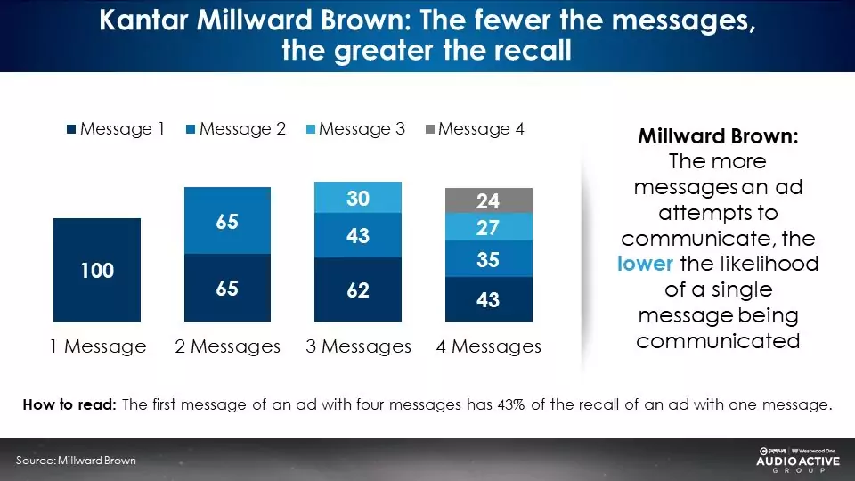 Copy testing giant Kantar Millward Brown finds the fewer the messages, the greater the advertising recall. Conversely, the greater the copy points, the less likely people will remember anything you said.
