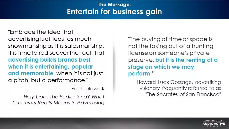 The best podcasts and AM/FM radio programs put on a show. They make you laugh. Why should audio ads be so dull and serious?