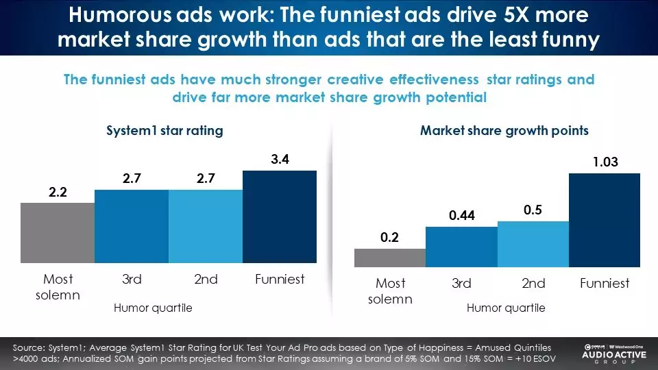 Orlando Wood, Chief Research Officer at System1, the creative testing giant, urges “Entertain for business gain!” System1 data says the greater the humor, the greater the market share growth: