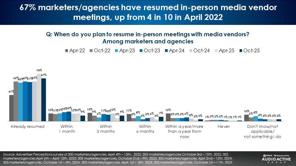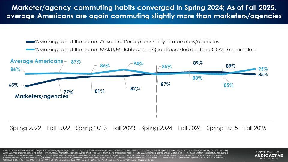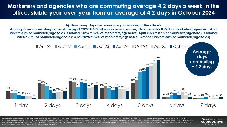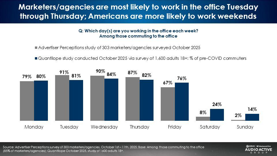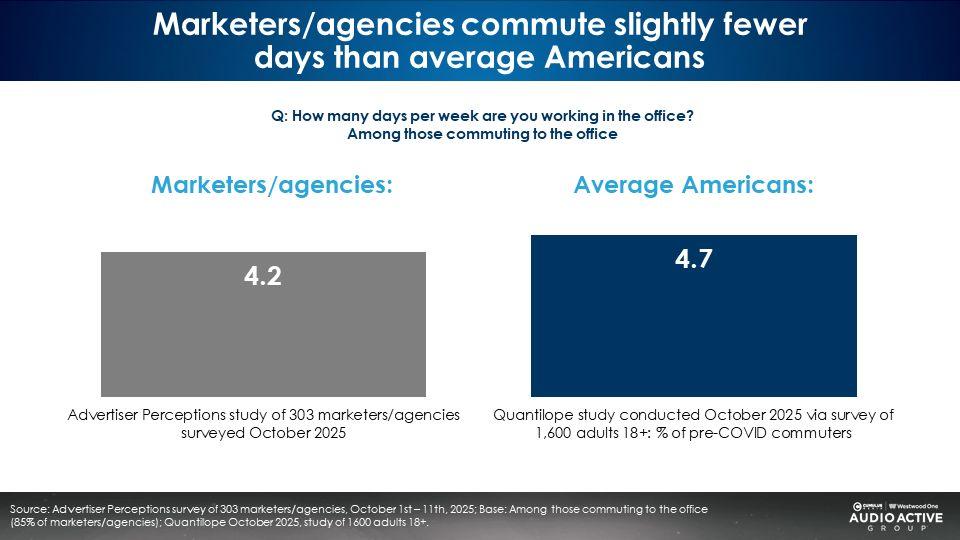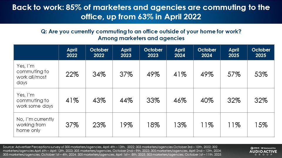 Marketers and media agencies are increasing their commutes and spending more days at the office, according to a brand-new Advertiser Perceptions study of 303 media agencies and brands commissioned by the Cumulus Media | Westwood One Audio Active Group®. Interviews took place October 1-11, 2025 and the results were compared to eight prior Advertiser Perceptions studies conducted since April 2022.