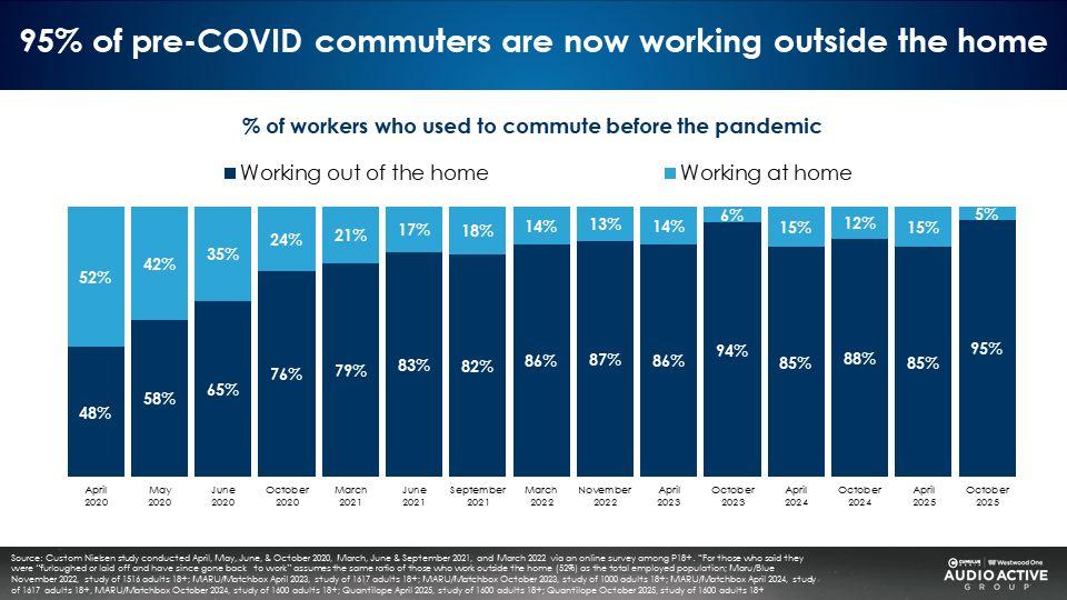 The Cumulus Media | Westwood One Audio Active Group® also commissioned a Quantilope national consumer study to examine the commuting habits of average Americans. The nationally representative study was also conducted October 2025 among 1,600 adults 18+. These results were compared to the same questions asked by Nielsen and MARU/Matchbox over the past five years.
