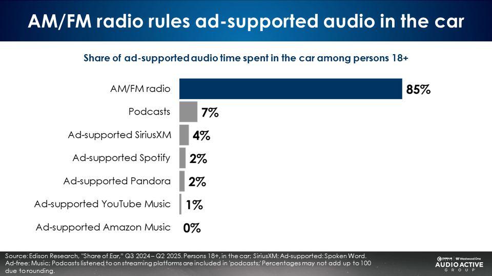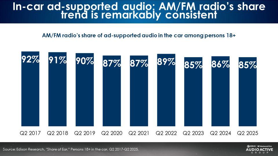 - AM/FM radio’s share of ad-supported audio in the car has been consistently dominant at an 85% share, according to Edison Research’s Q2 2025 “Share of Ear” report