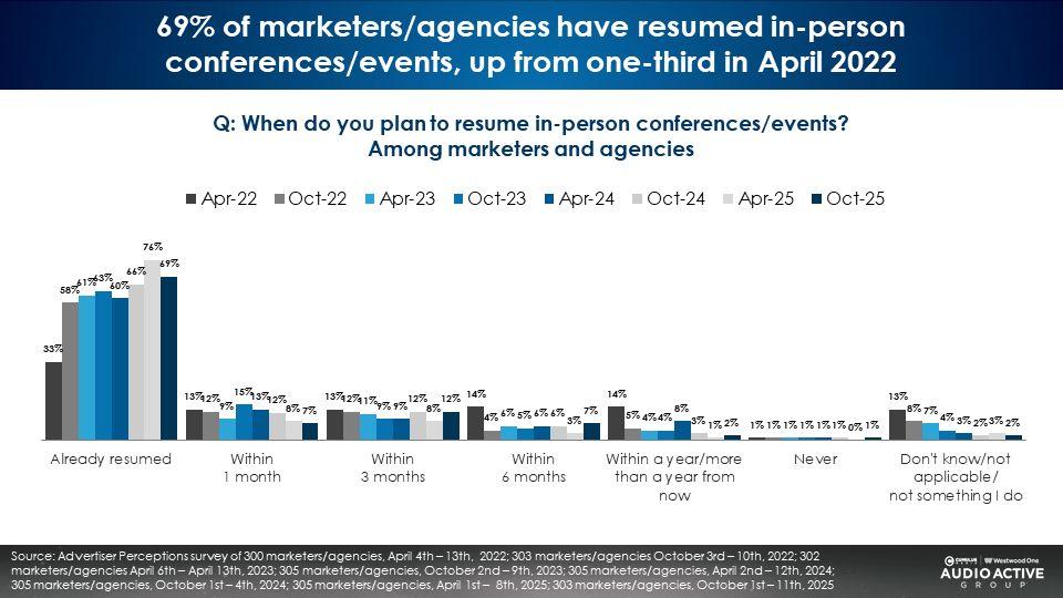 67% of marketers and agencies have resumed in-person media vendor meetings; 69% have resumed in-person conferences and events