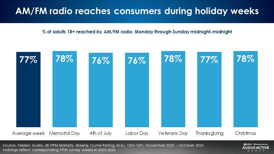 - AM/FM radio advertising drives retail results: AM/FM radio reaches 77% of adults 18+ during Thanksgiving week and 78% during Christmas week