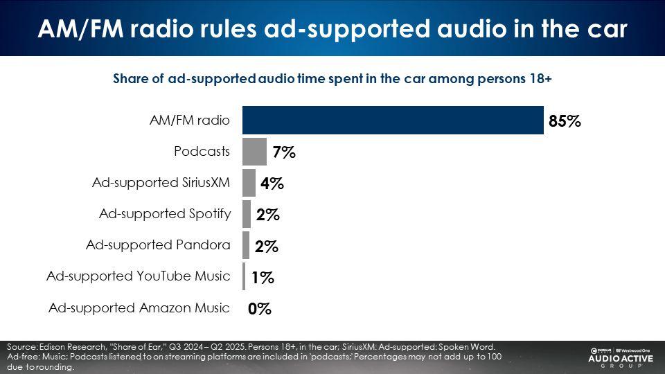 When consumers are in their cars, 85% of ad-supported audio time spent goes to AM/FM radio, according to Edison Research’s Q2 2025 “Share of Ear.” Shoppers hear AM/FM radio commercials that influence the stores they visit and brands they buy.