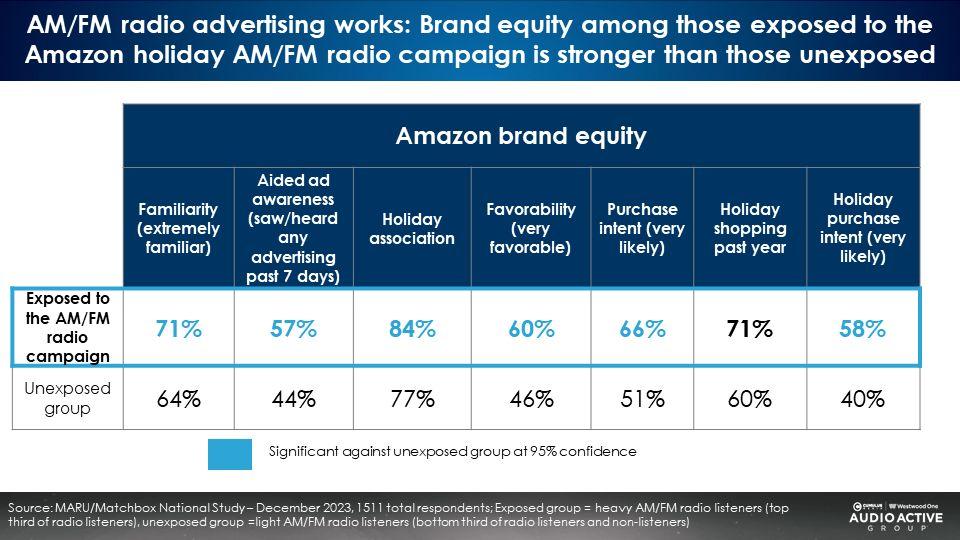 MARU/Matchbox conducted a campaign effect study of the December 2023 Amazon holiday campaign. Comparing those exposed to the AM/FM radio campaign versus those not exposed reveals stronger brand familiarity, advertising recall, holiday association, favorability, purchase intent, and prior purchase.