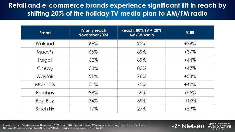 - “20 gets you 50”: Retailers can generate a +50% incremental reach increase to their TV investment by shifting just 20% of their holiday media plan to AM/FM radio