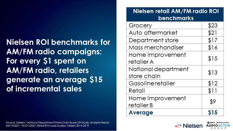 Nielsen: AM/FM radio campaigns generate extraordinary return on advertising spend for retailers; For every dollar spent, $15 dollars of incremental sales are generated