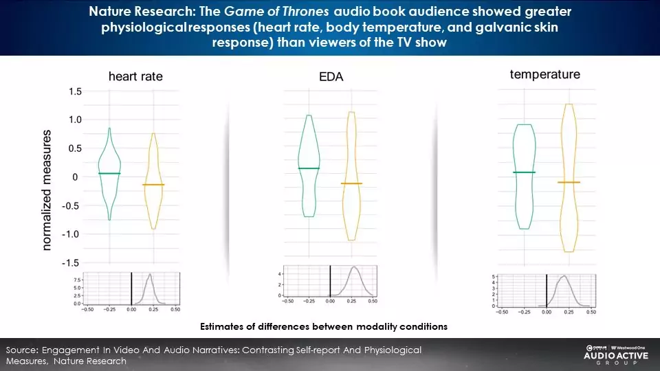 Consumers are far more engaged with an audio story than a video narrative. The Game of Thrones audio book audience showed greater physiological responses (heart rate, body temperature, and galvanic skin response) than viewers of the TV show.