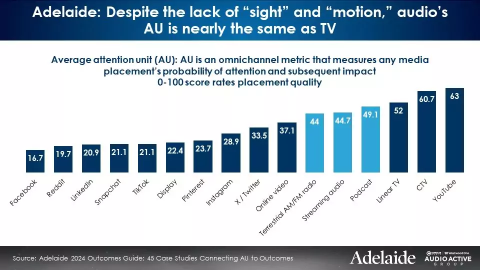 Adelaide AU scores: Despite the lack of “sight and motion,” audio platforms generate nearly the same attentiveness as TV