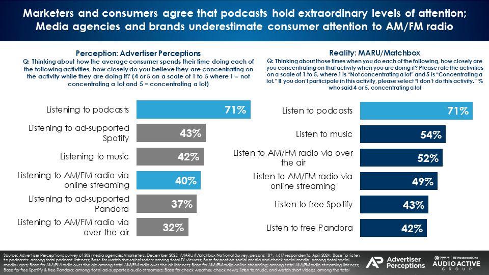 Marketers and consumers agree that podcasts hold extraordinary levels of attention; Media agencies and brands underestimate consumer attention to AM/FM radio