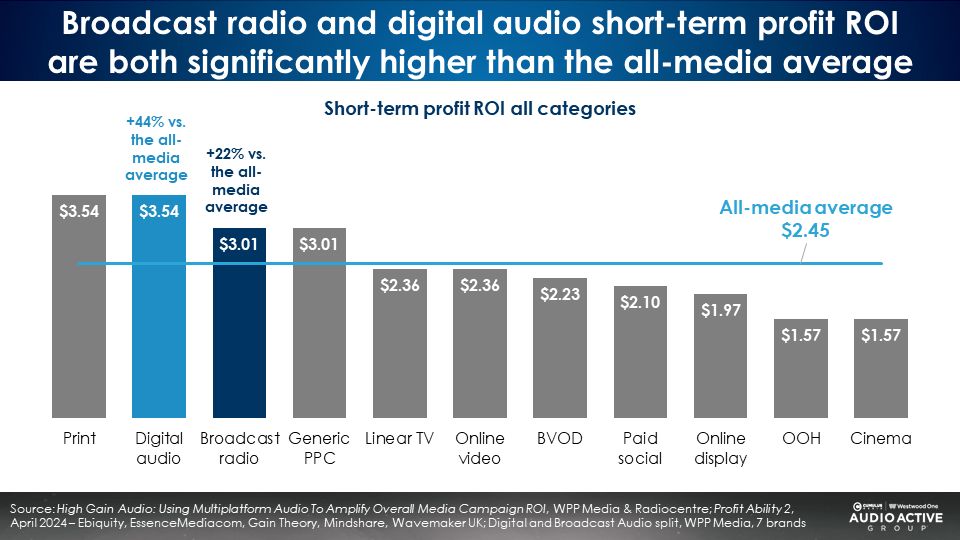 - WPP Media: Digital audio’s short-term ROI is tied for first, outperforming the all-media average by +44%. Broadcast radio is second in ROI, surpassing the all-media average ROI by +23%.