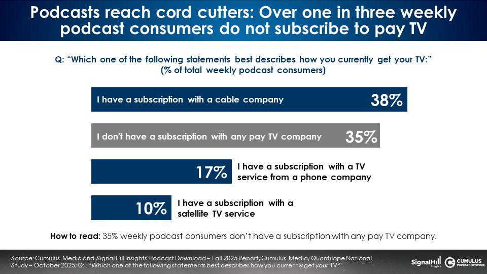 - Podcast consumers are cord cutters with a third of weekly consumers not subscribing to pay TV
