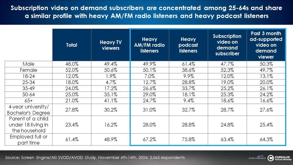- The audience profile of video streamers closely aligns with podcast and AM/FM radio listeners, not linear TV viewers, according to Screen Engine/ASI