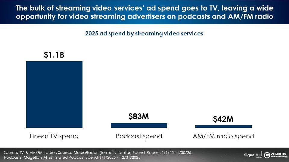 According to Kantar, video streaming platforms spent $1.1 billion from January to November 2025 on linear TV to market their subscription services and promote show launches. Podcasts and AM/FM radio received significantly less investment.