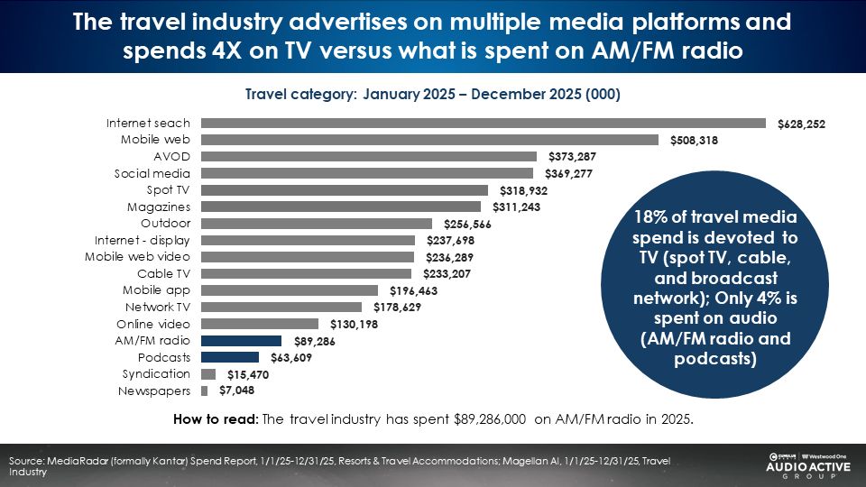 MediaRadar reports of the four billion dollars spent in the travel category, 18% is devoted to linear TV and only 4% to AM/FM radio and podcasts