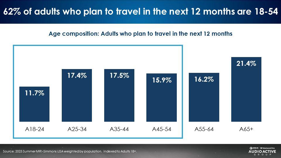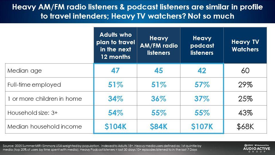 Compared to those who intend to travel in the next twelve months, heavy AM/FM radio listeners and podcast listeners have very similar age profiles, employment, presence of children, household size, and income levels.