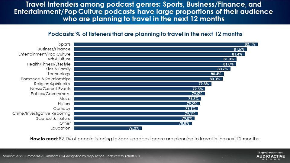 • A wide variety of podcast genres and AM/FM radio programming formats reach those who intend to travel in the next year
