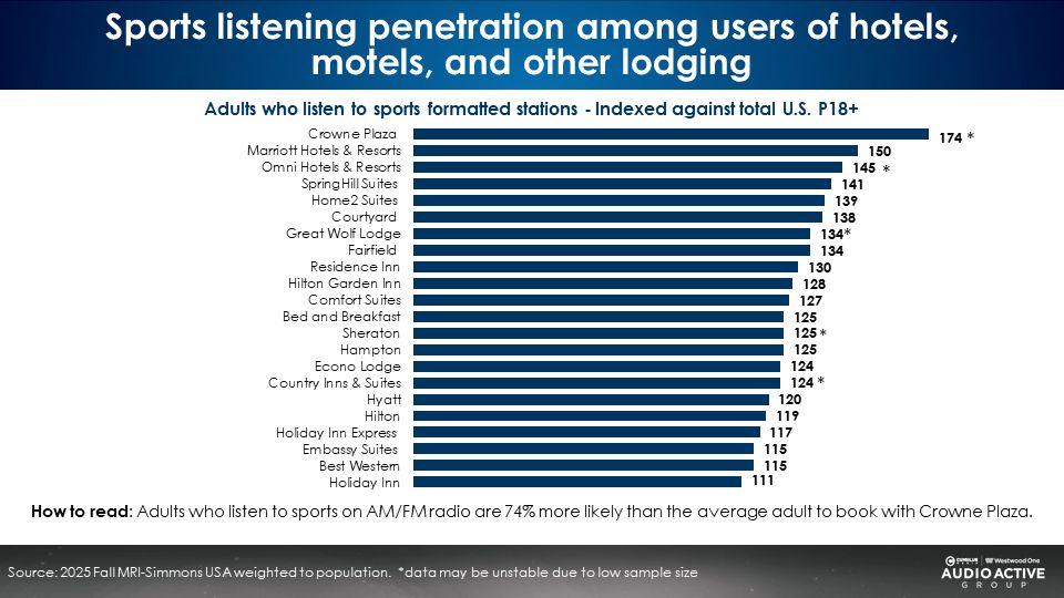 Compared to the average adult, sports AM/FM radio listeners are much more likely to frequent major hotel chains like Marriott, Omni, Fairfield, and Hilton.