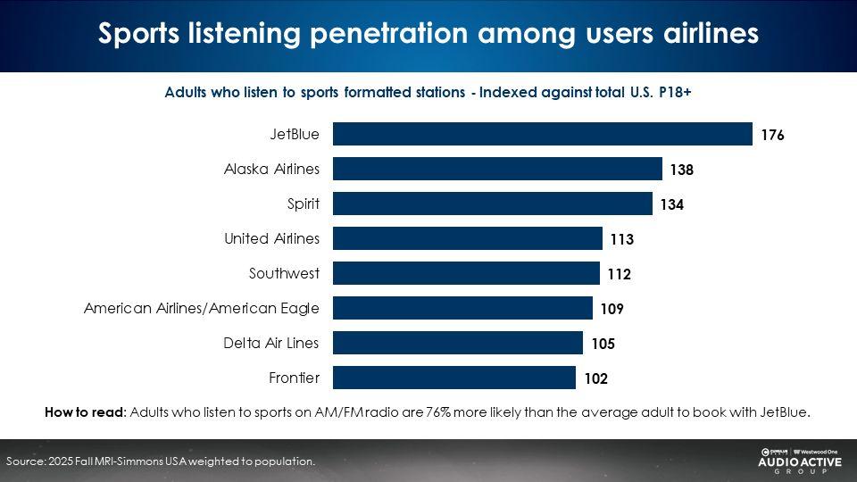 Similarly, sports AM/FM radio listeners over index for traveling on major airlines like JetBlue, United, American Airlines, and Delta.
