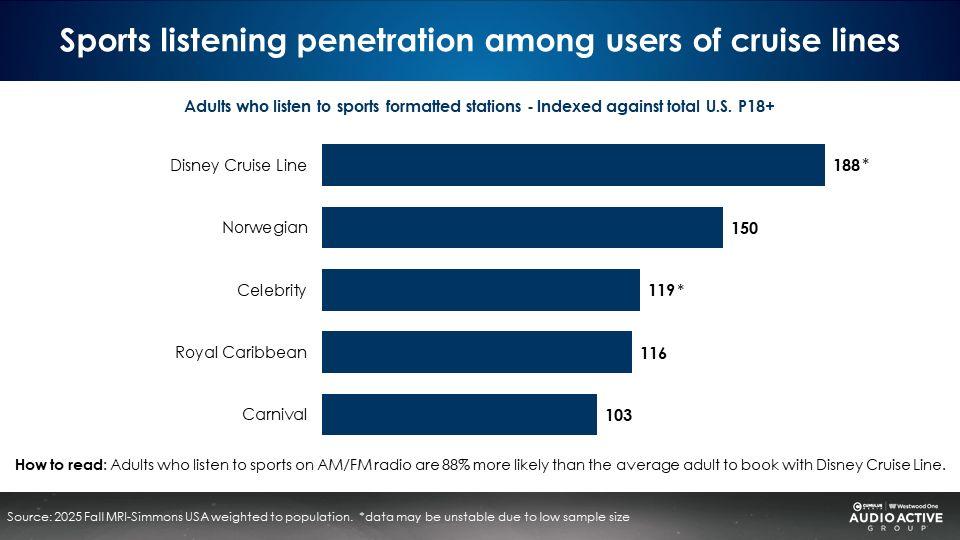 Across cruise lines like Disney, Norwegian, Celebrity, Royal Caribbean, and Carnival, sports AM/FM radio listeners are more likely to book than the average adult.