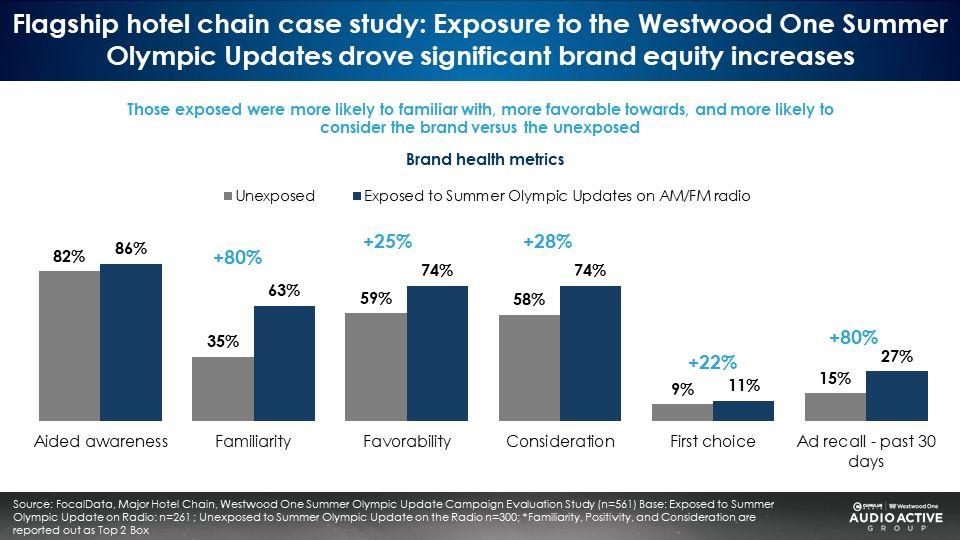 Those exposed to Westwood One Sports Olympics reports have an +80% increase in familiarity for the flagship hotel brand, a +25% increase in brand favorability, +28% lift in brand consideration, and an +80% increase in ad recall.
