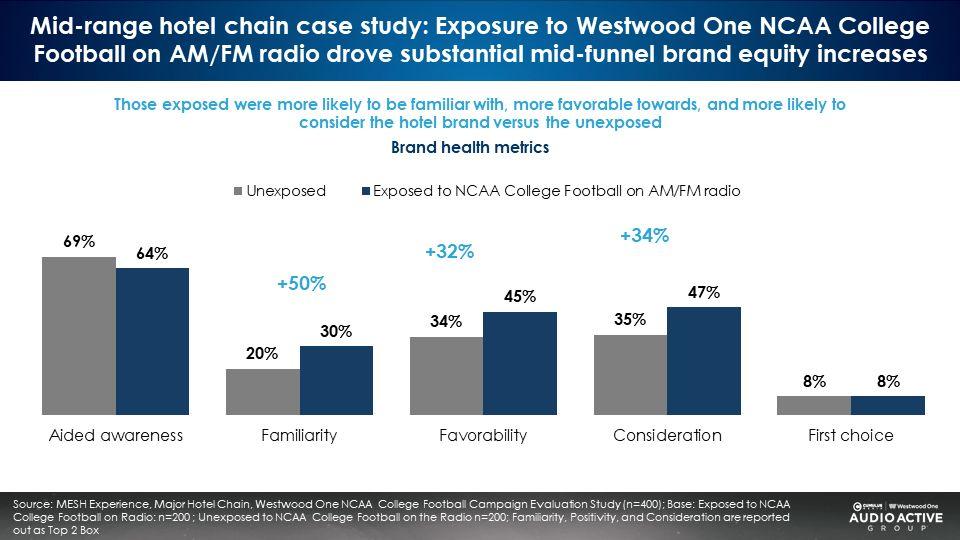 Those exposed to Westwood One’s NCAA play-by-play broadcasts of NCAA football have a +50% greater familiarity with the hotel brand, a +32% increase in brand familiarity, and a +34% growth in brand consideration.