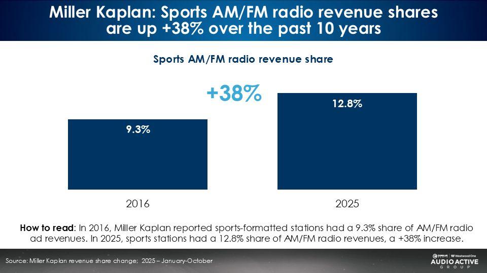 Reaching one of six American men, the number of sports stations has grown +14% over the last decade, while Miller Kaplan revenue shares have surged by +38%
