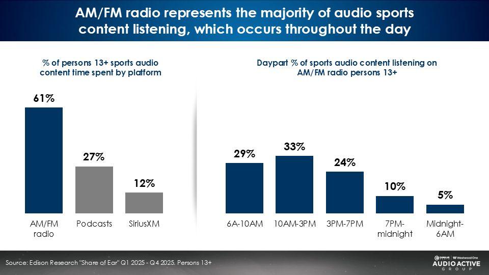 According to Edison Research’s “Share of Ear” study, 61% of all U.S. sports audio time spent occurs on AM/FM radio, followed by podcasts (27%) and Sirius XM (12%).