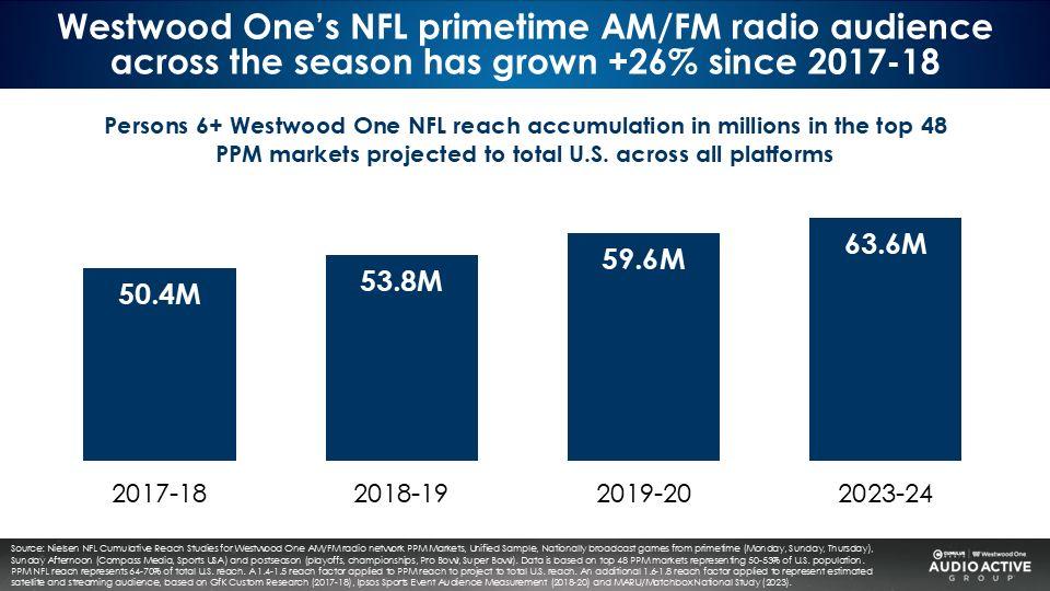 Nielsen reports audiences to Westwood One’s NFL prime time national broadcasts have grown 26% of the last decade.