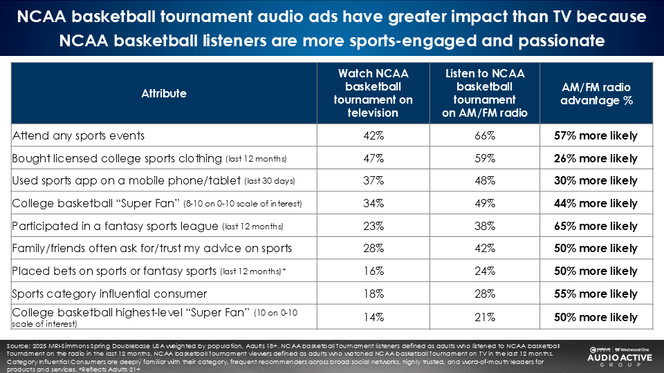 Consider the March Madness audience. Compared to college basketball TV viewers, Westwood One’s NCAA basketball AM/FM radio audience is far more sports passionate across nine measures of sports engagement, according to MRI-Simmons.