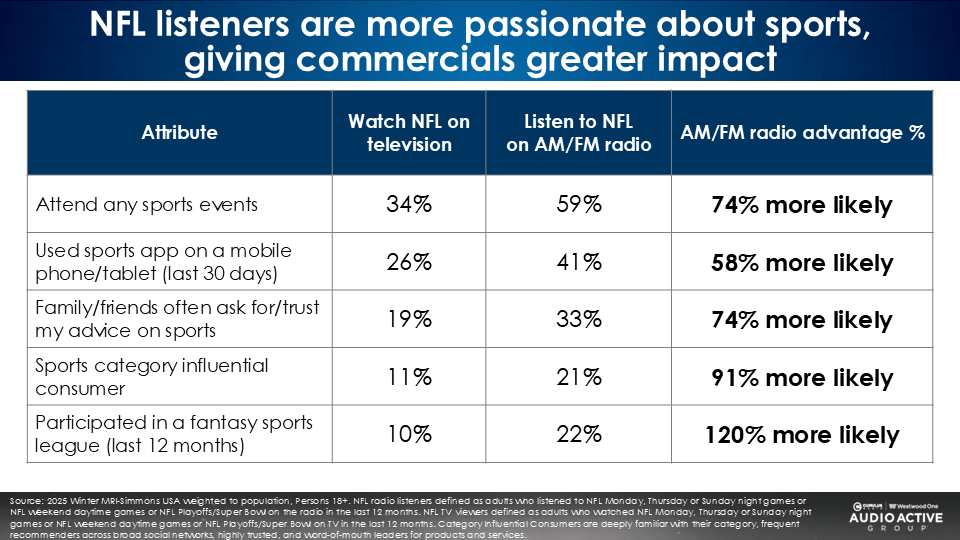 When it comes to the NFL, MRI-Simmons reports the NFL AM/FM radio audience is much more sports engaged than NFL TV viewers.