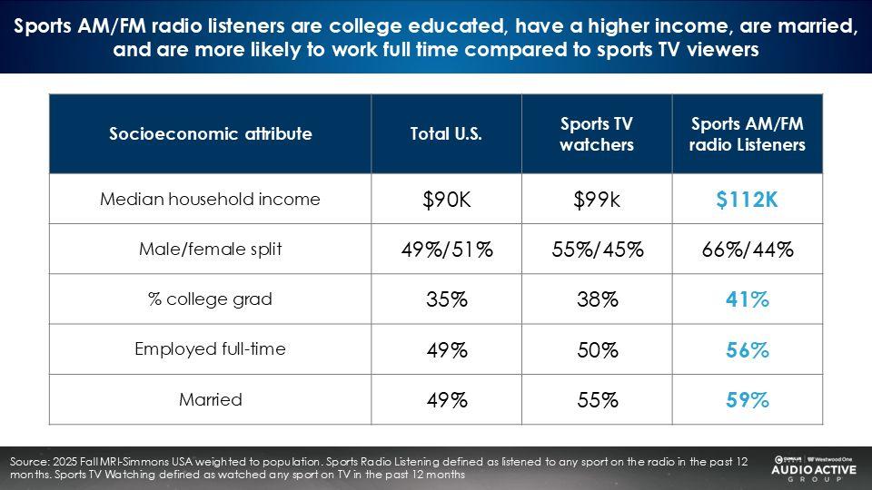 Compared to the sports TV audience, the sports AM/FM radio audience is more upscale, more likely to be employed, college educated, and married