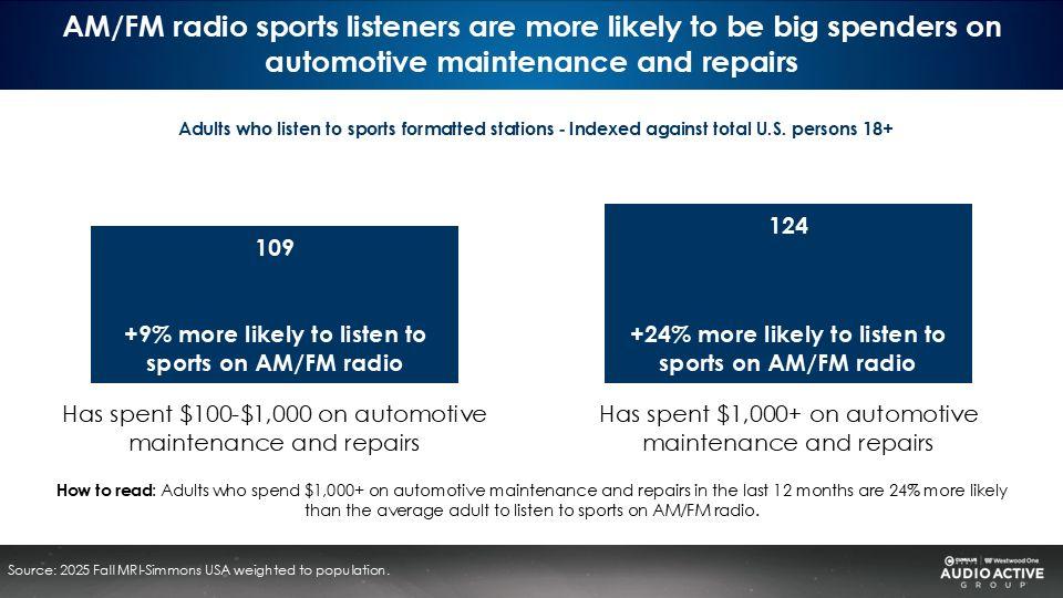 The sports AM/FM radio audience is 24% more likely than the U.S. average to spend $1000 on auto repair and maintenance.
