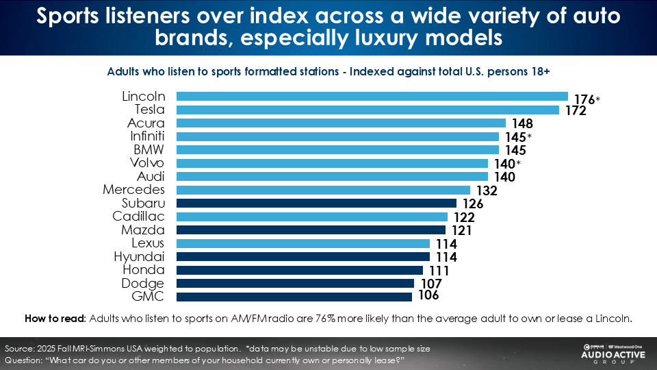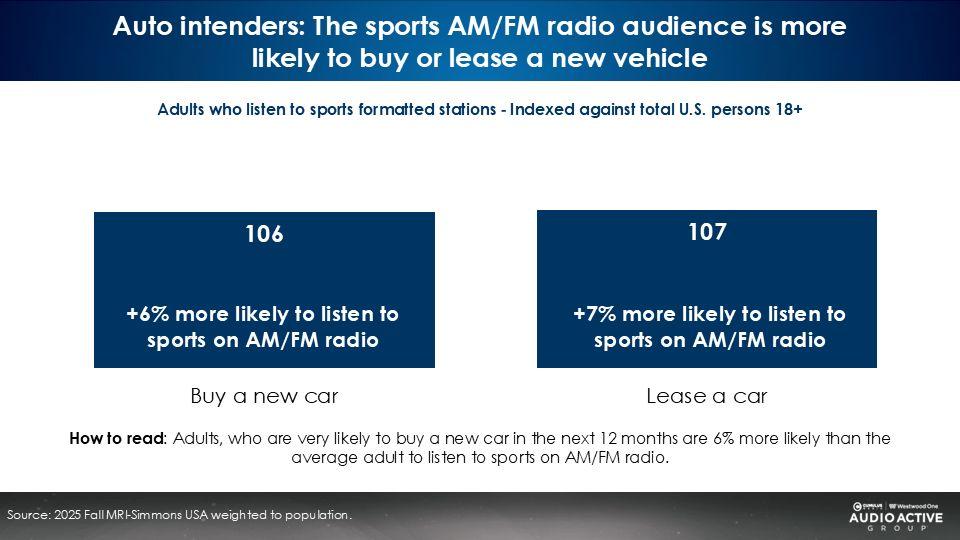 The sports AM/FM radio audience is 6% more likely to be in the market for a new vehicle and 7% more likely to lease a car.