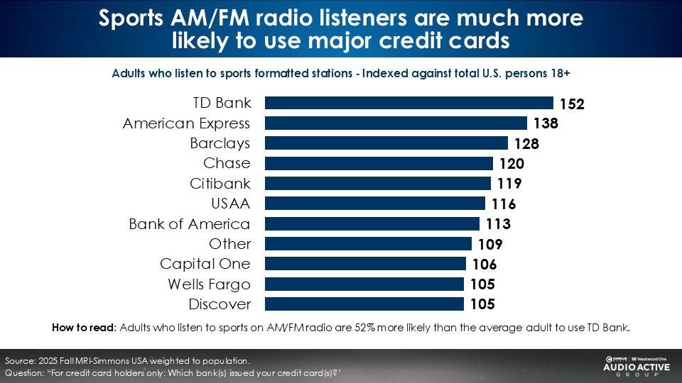 The sports AM/FM radio audience over indexes for a wide array of financial institutions and major credit cards.