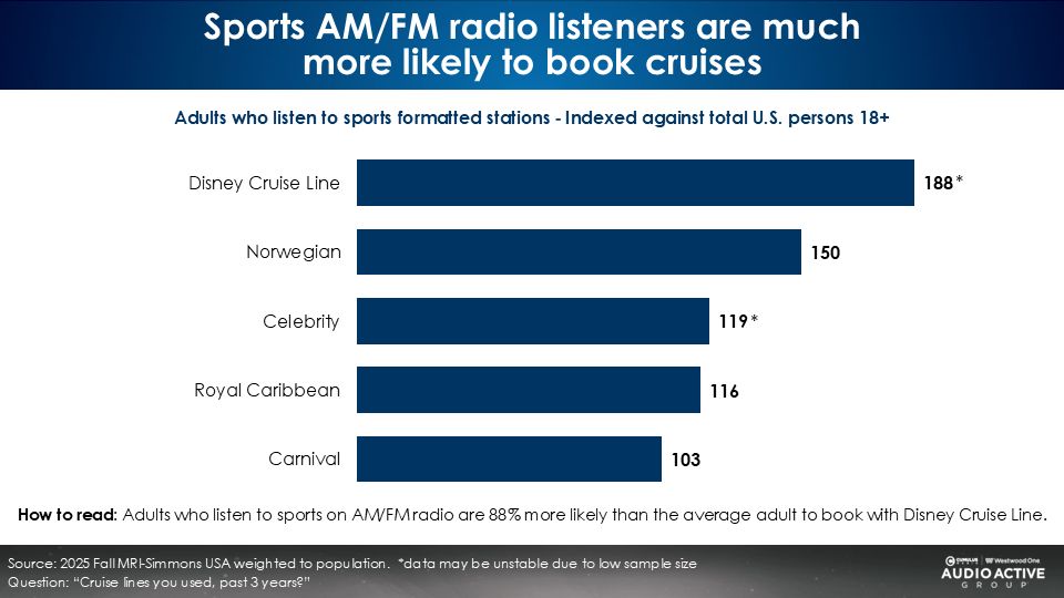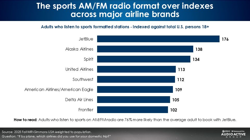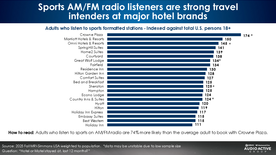 Across major hotel brands, airlines, and cruises, the sports AM/FM radio format over indexes.