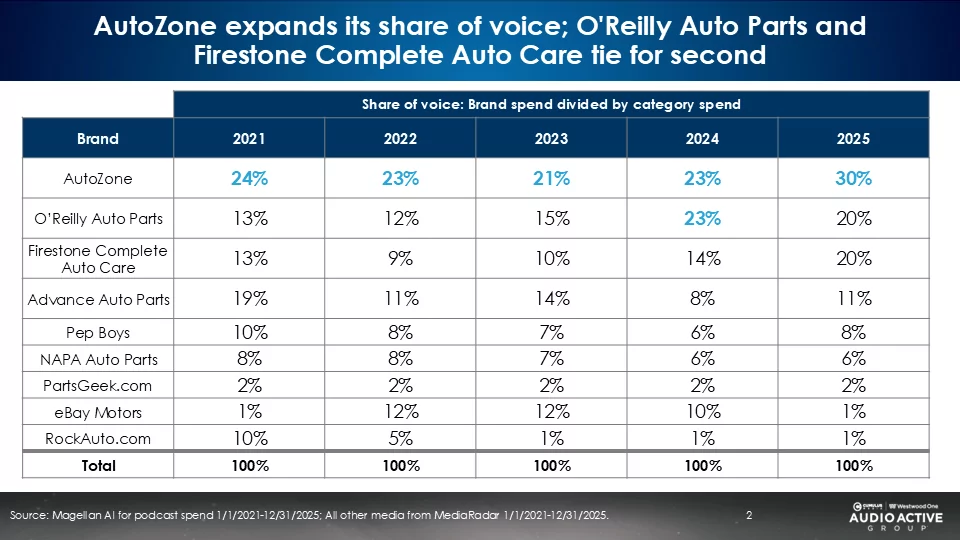 AutoZone regains its share of voice lead; O’Reilly Auto Parts and Firestone Complete Auto Care tie for second
